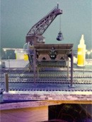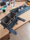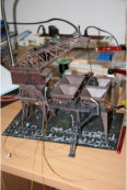 Die nächste Platine ist eine zurechtgezimmerte Hausbeleuchtungsplatine mit Erweiterungen (3teilig), die als Motoransteuerung dient. Damit dreht sich der Kran im Programmablauf einmal zu den Kohlebunkern hinterm Kran und wieder nach vor zu den Bekohlungstrichtern. Die Zeit war um ca. 2 Sekunden zu kurz, zumal der gesamt Kran nicht direkt hinter der Bekohlung platziert wurde. Da wir dessen Treppenbeleuchtung auch sehen wollten, steht der Kran seitlich versetzt.