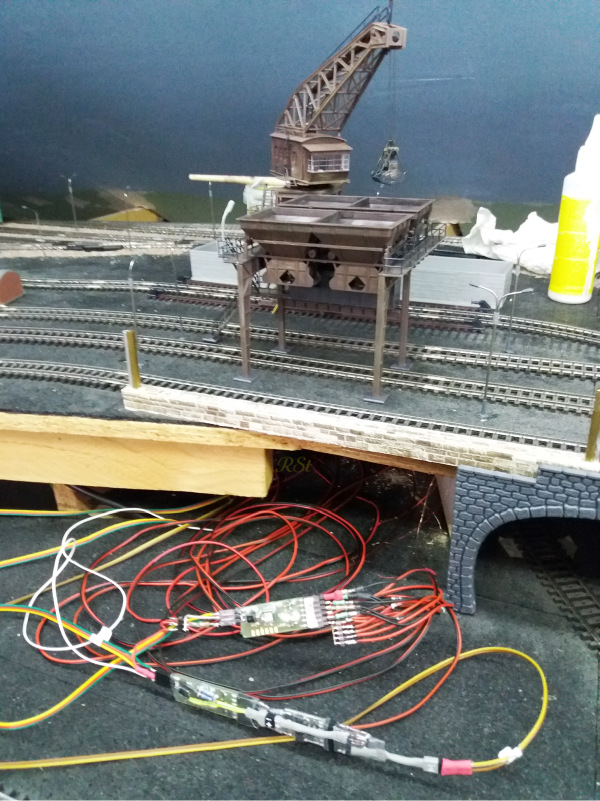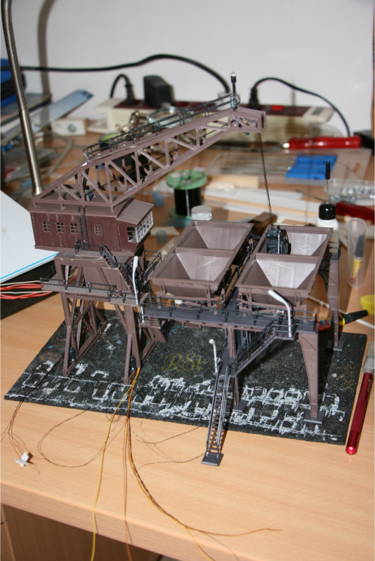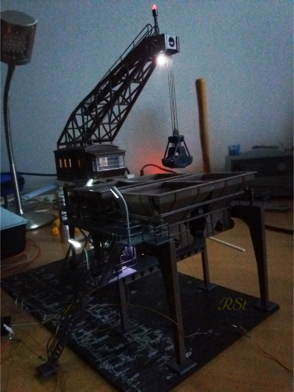 Die Großbekohlung wurde vollständig auf der Anlage aufgestellt und die Verdrahtungsausführungen unter der Platte soweit mit Kabeln verlängert, um anschließend bequem die Steuerplatinen anschließen zu können. Dazu wurde die Hausbeleuchtungsplatine BEL5 mit 4 Ausgängen und 2 Programmen (Abend- und Morgenprogramm) verwendet. Damit wurde Krankabinenlicht, die Peitschenlampen an den Treppen, Scheinwerfer am Kranausleger für die Kranschaufel und die Gangbeleuchtung rund um die 4 Bekohlungstrichter angesteuert. Das rote Positionslicht wurde direkt an die nächtliche Dauerspannung angeschlossen.