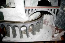 Jeder Bogen der Eisenbahnbrücke wird ebenfalls mit einer weißen LED beleuchtet. 2x 4 in Serie geschaltete LED mit einem Poti als Vorwiderstand. Eine hohe Potieinstellung verbraucht zwar weniger Strom, die Ausleuchtung war aber dementsprechend schlecht. Für eine gut sichtbare Ausleuchtung (die auch nicht so stark ins blaue geht) wurde der Poti fast auf 0 (einen Tick vor dem Anschlag) gestellt. |