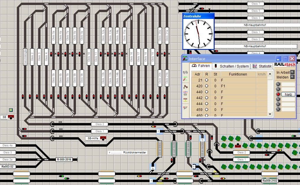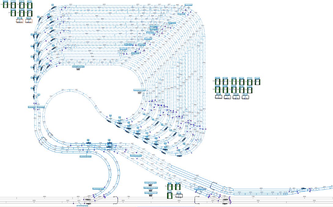 Einblick in den Schattenbahnhof mit gut gefüllten Abstellgleisen mit bereits eingemessenen automatischen Zügen.
