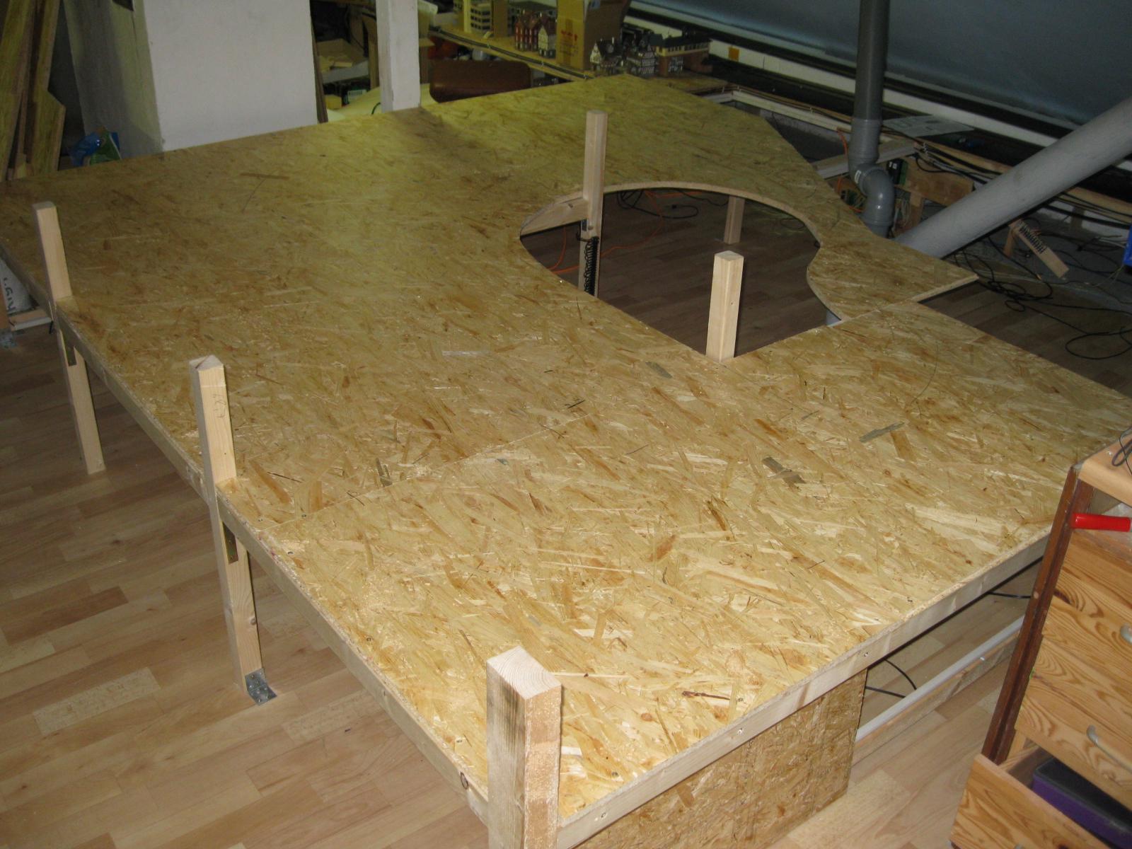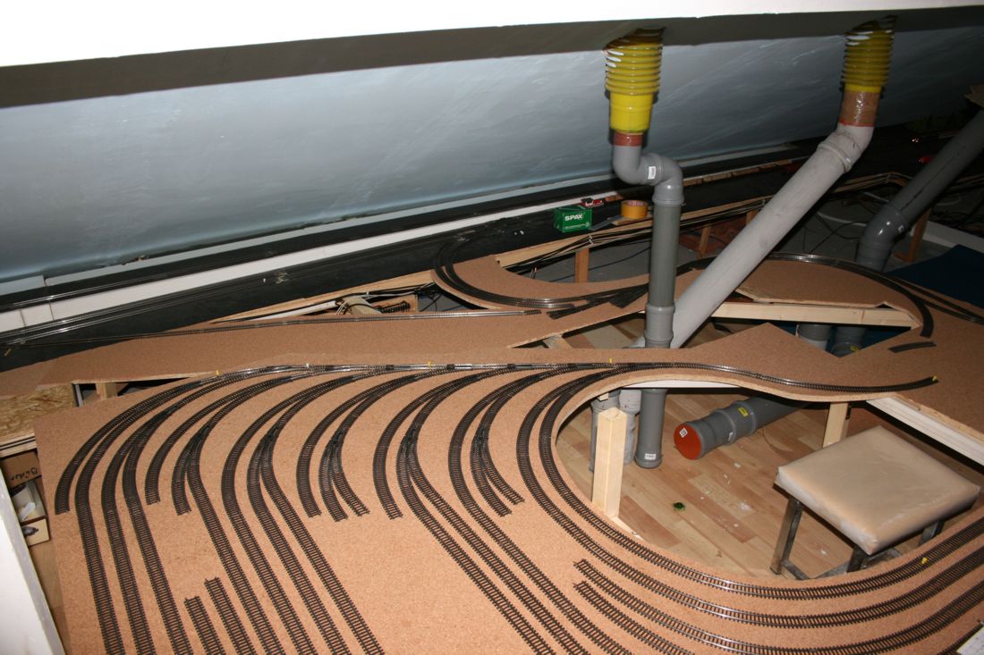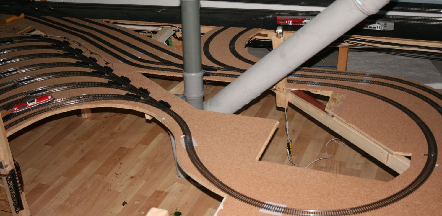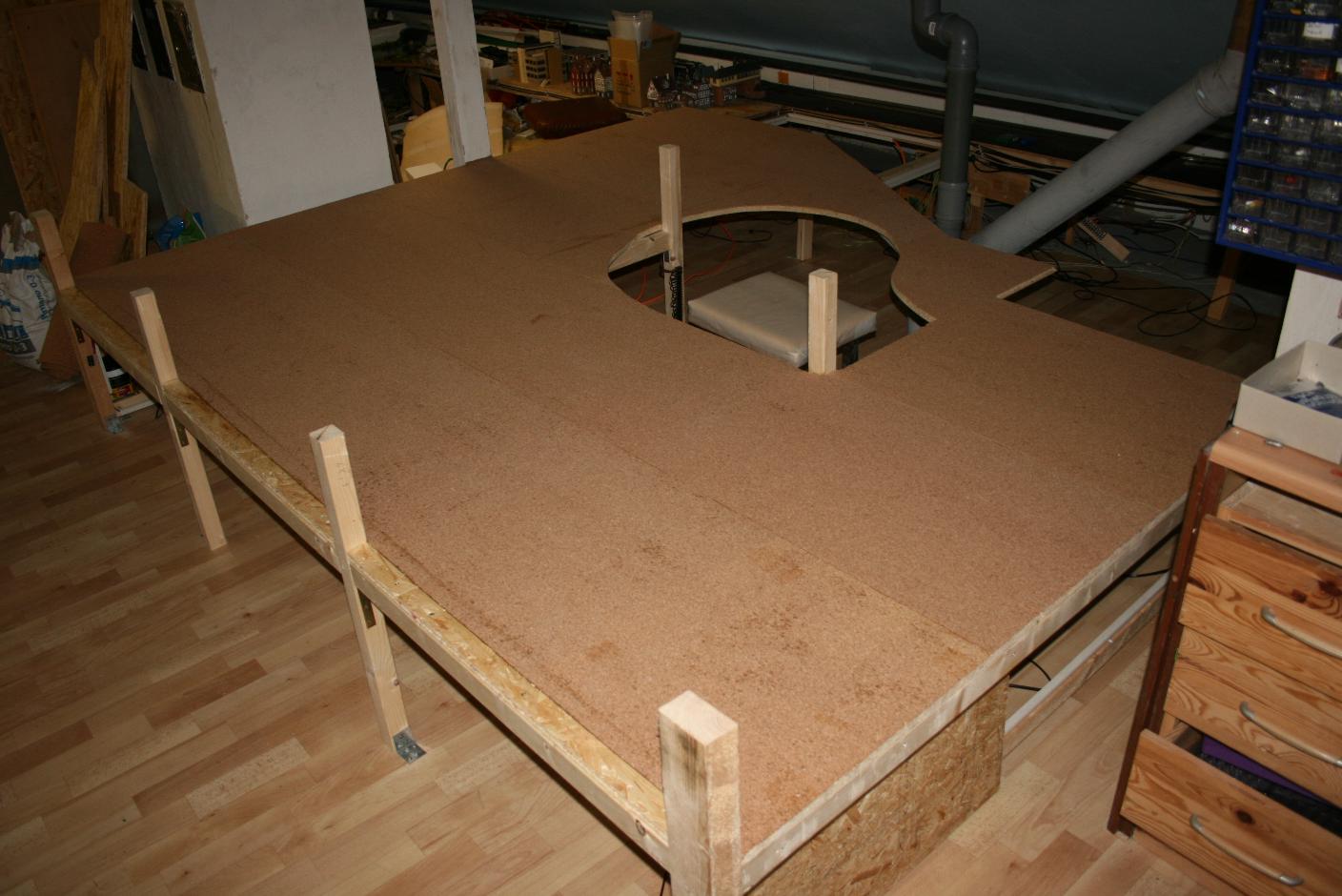 Jetzt sieht die Sache schon fast brauchbar aus. Die Platten liegen und sind verschraubt. Im nächsten Arbeitsgang wird ein Korkbelag aufgeklebt. Im Bild sieht man bereits die erste aufgeklebte Korkbahn. Dadurch wird der Fahrlärm der Züge auf nahezu Null reduziert. |
