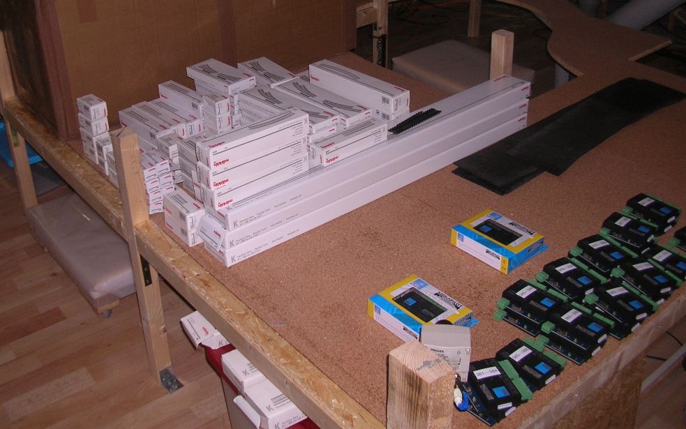 Nach längerer Suche eines Lieferanten für unsere Gleise war es am 18. November soweit. Gleismaterial und Decoder sind eingetroffen. Leider können wir nicht gleich mit der Gleisverlegung beginnen. Durch die notwendige Erweiterung des Rückmeldesystems musste dieses neu aufgebaut und verkabelt werden. Dies nimmt in der bereits vorhandenen Anlagengröße einige Zeit in Anspruch. Aber 2013 wird der Schattenbahnhof sicher fertig werden. Schließlich stirbt die Hoffung zuletzt. |