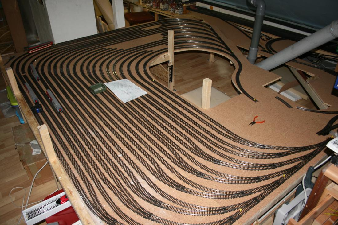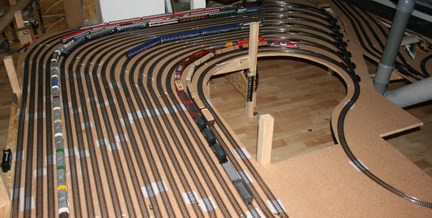 Nun war es soweit. Der Schattenbahnhof wird in Angriff genommen.. Die Planung lief schon viele Jahre. Immer wieder wurde umgeplant um das Optimum an Abstellfläche rauszuholen. Da nur eine rechteckige Fäche von 280cm x 260cm zur Verfügung stand, enthalten die einzelnen Abstellgleise des Schattenbahnhofs eine 90 Grad Kurve. Die Gleise wurden mit so wenig Abstand wie nur möglich geplant. Die lichte Weite zwischen den Gleisen beträgt etwa 17mm und in den Bögen etwa 35mm. 20 Abstellgleise und ein Durchfahrgleis. Mehr war bei bestem Willen nicht unterzubringen. 11 Gleise wurden geteilt, so dass zwei kurze Züge hintereinander untergebracht werden können. Die Gleislänge variiert zwischen 1 m (kürzere Züge) und 3,8m. Somit können 31 Züge untergebracht werden. Die besondere Herausvorderung war, dass der Schattenbahnhof die Haupt- und die Nebenbahn gleichermaßen bedienen muss. Dies erfordert eine etwas umfangreichere Zu- und Ausfahrt. |