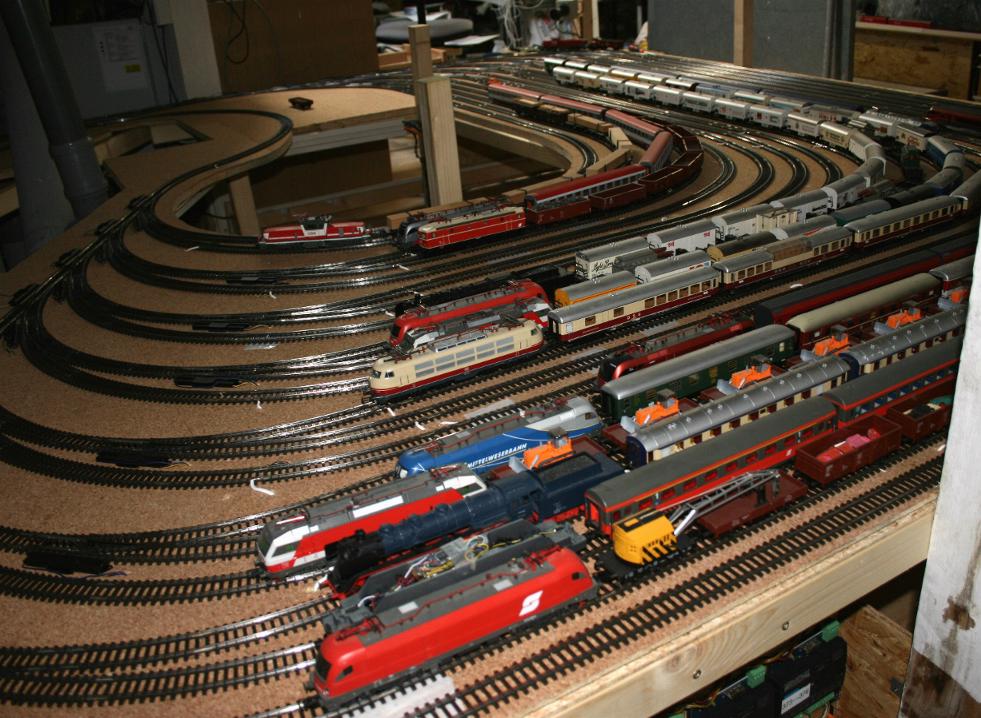 Die Gleise füllen sich schön langsam mit diversen Zügen der Hauptbahn. Der Nebenbahnanschluss muss noch gebaut werden. Danach kann der Schattenbahnhof, der noch nicht im Schatten liegt, in Vollbetrieb gehen. |