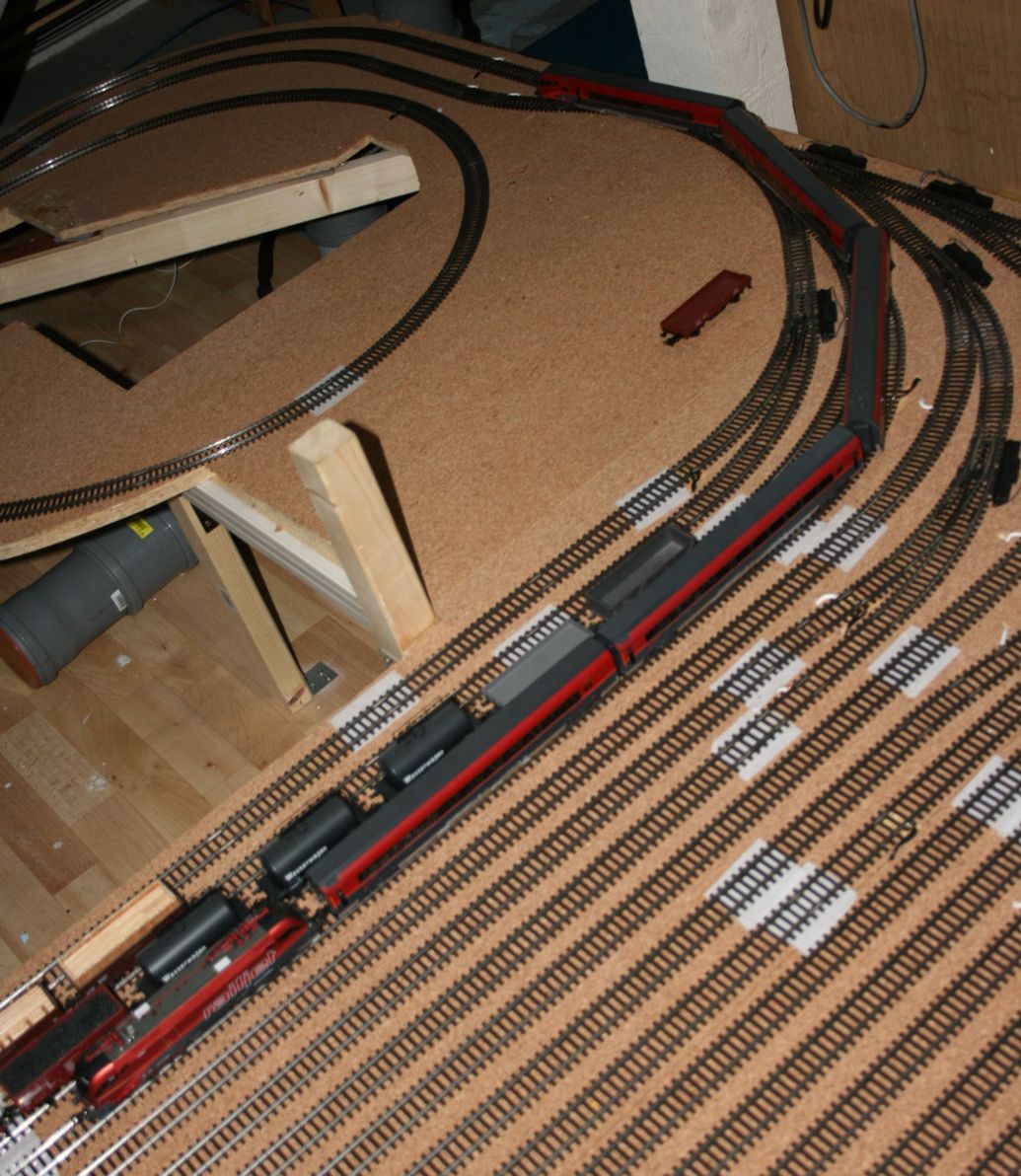 Nach einer kurzen Pause arbeiten wir am Schattenbahnhof weiter. Da diese Gleise in das Rückmeldesystem integriert werden müssen, mussten wir es komplett neu aufbauen. Dies dauerte einige Zeit. Die Spannung war groß, ob die Planung mit WinTrack auch auf die aufgebaute Platte passen würde. Da gab es kaum einen Millimeter Spielraum. Also wurde das Gleissytem des Schattenbahnhofes mal zum Probeliegen aufgebaut und laut Plan eingemessen. Der für mich absolut spannenste Teil war das Austesten der Parallelgleisbögen mitten im Schattenbahnhof. Warum? Na, die Gleisabstände waren nicht standard. Ich habe so eng wie nur möglich geplant um den Raum so gut wie möglich zu nutzen. Es sollte mit rollendem Material bis zu einer Länge von 29 cm gerade noch ohne Berührung eine Vorbeifahrt in den Kurven möglich sein. Die Tests vielen positiv aus. Glück gehabt. Eine Umplanung hätte uns zeitlich ziemlich zurück geworfen. Wie sich zeigte, hatten wir auch einige Wagen mit deutlich über 30 cm. Die dürfen im Schattenbahnhof nicht verkehren. Die Aus- und Einfahrt zur Haupt- und Nebenbahn kommt als letzter Schritt. Hier kann man noch ein wenig "schwindeln" falls das Ganze doch nicht so millimetergenau ist wie geplant . Doch das ist ein Thema für die nächsten Wochen. |
