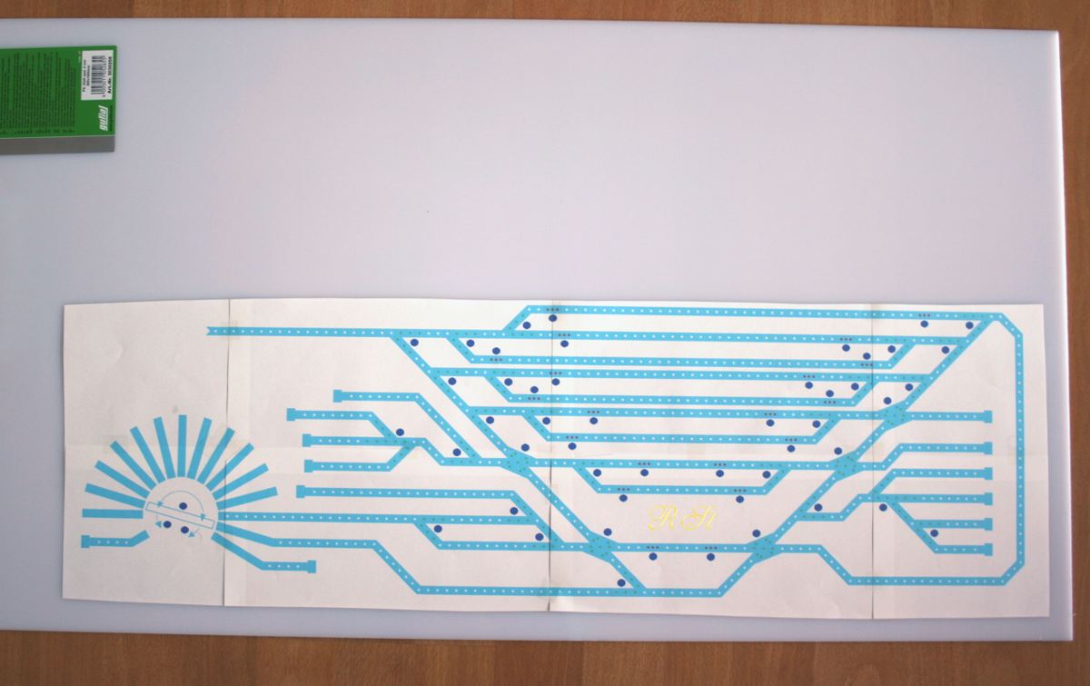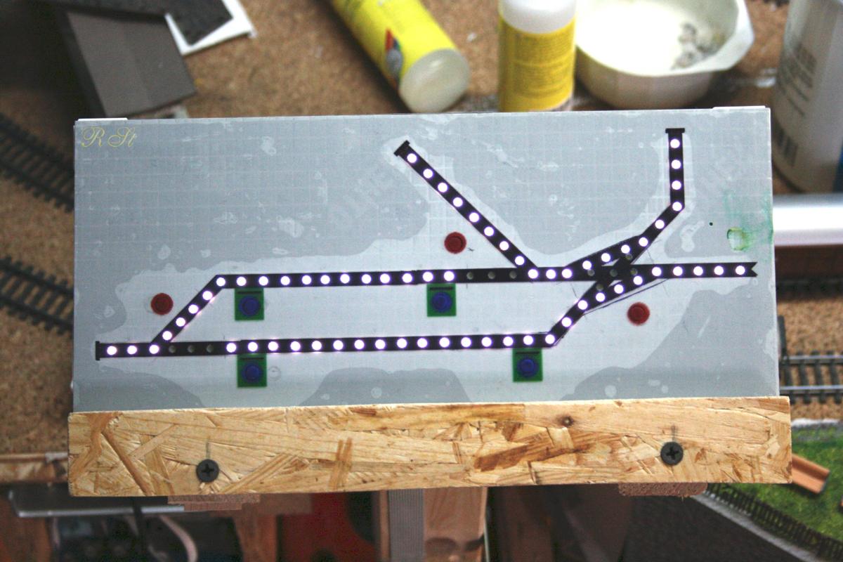 | Das Stellwerk hat auch ein Innenleben: die beleuchteten Stellpulte, die in rot und grün abwechselnd verschieden aufleuchten. Gesteuert auch wieder mit selbstgebauten Beleuchtungsplatine. |