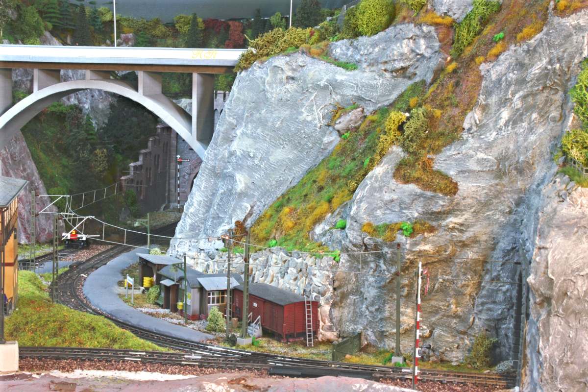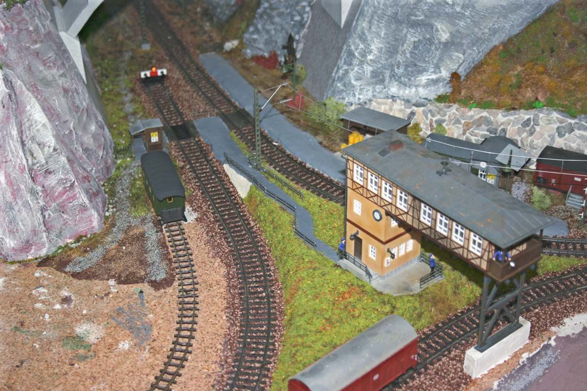 | H0e-Waggon und Fahrkartenhäuschen für die Erzbergwerksarbeiter. Erhöhtes Brückenstellwerk mit Anschlußweg zum Gleisübergang. |