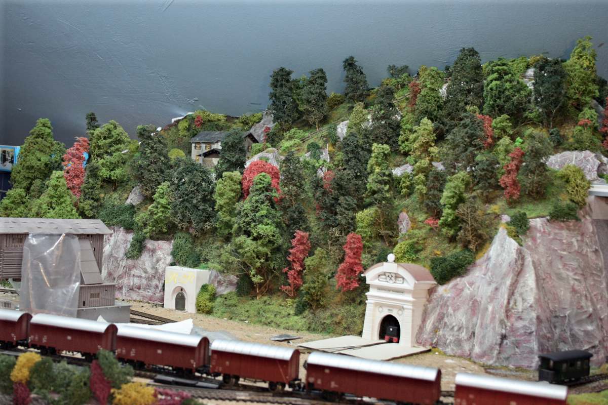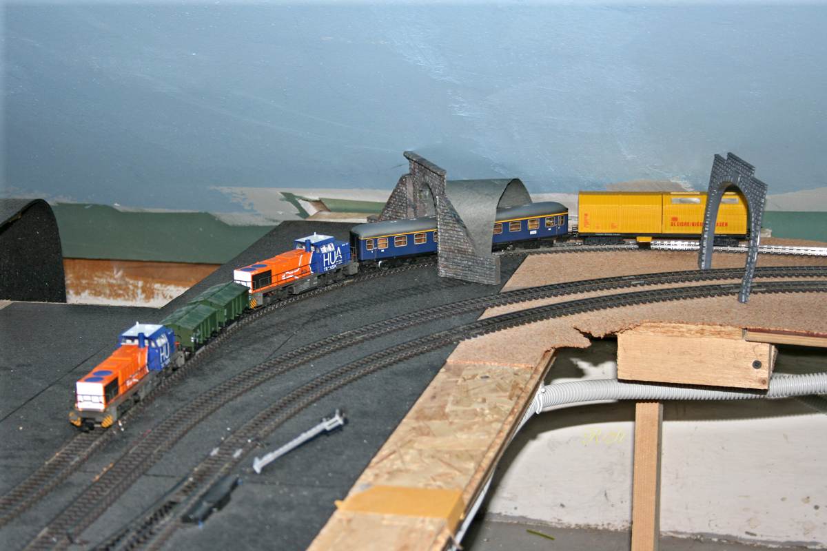 Der Reinigungszug auf der Nebenstrecke vor dem Hauptbahnhof. 2 Tunnelportale für den noch nicht vorhandenen Bergansatz. |