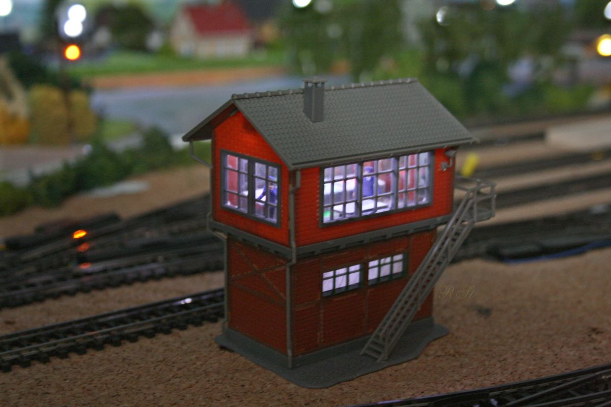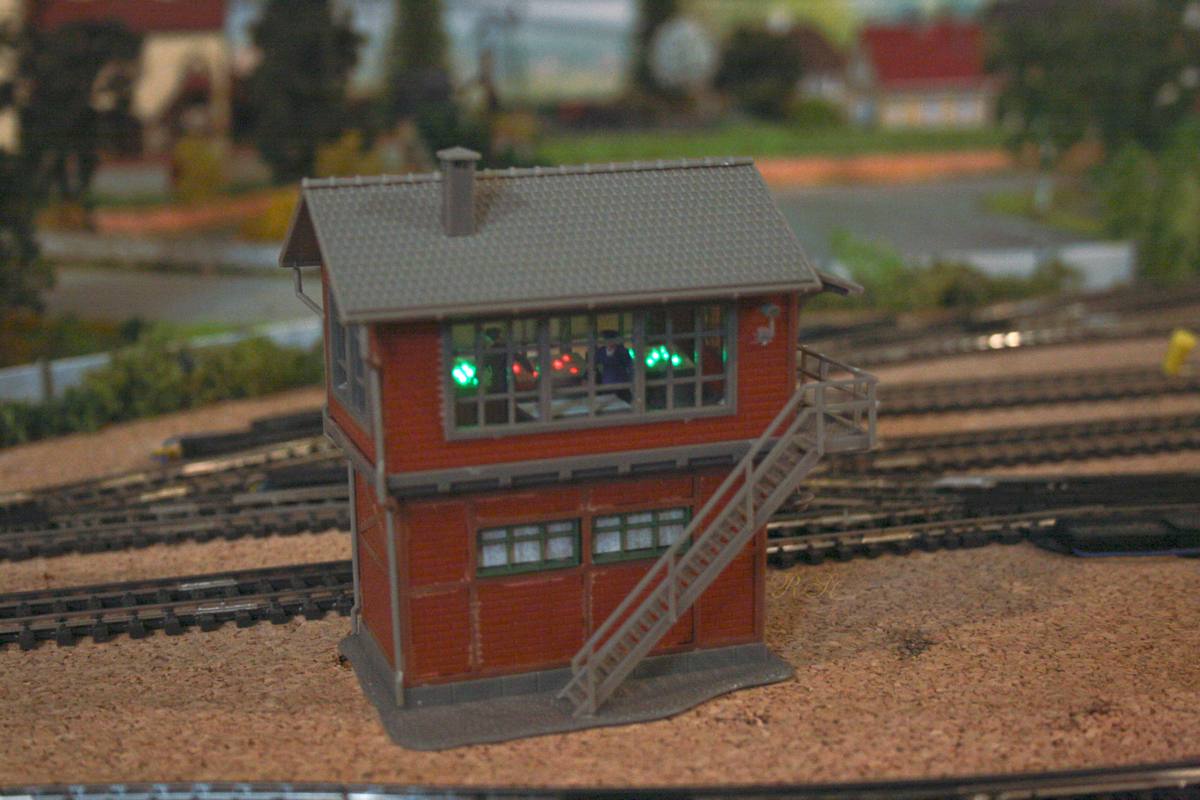 | Das erste Stellwerk für den Nebenbahnhof mit Innenbeleuchtung. Die Beleuchtung wird für den Abend und Morgen unterschiedlich mit der selbstgebauten Beleuchtungsplatine geschalten. |