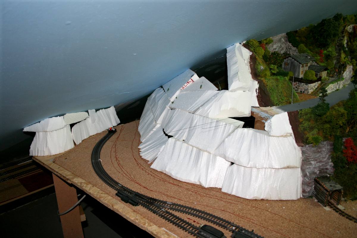 | Die Weiterführung der Bergstraße vom Erzberg kommend führt über diesen Abgrund rüber zum Plateau des Verschubbahnhofs |