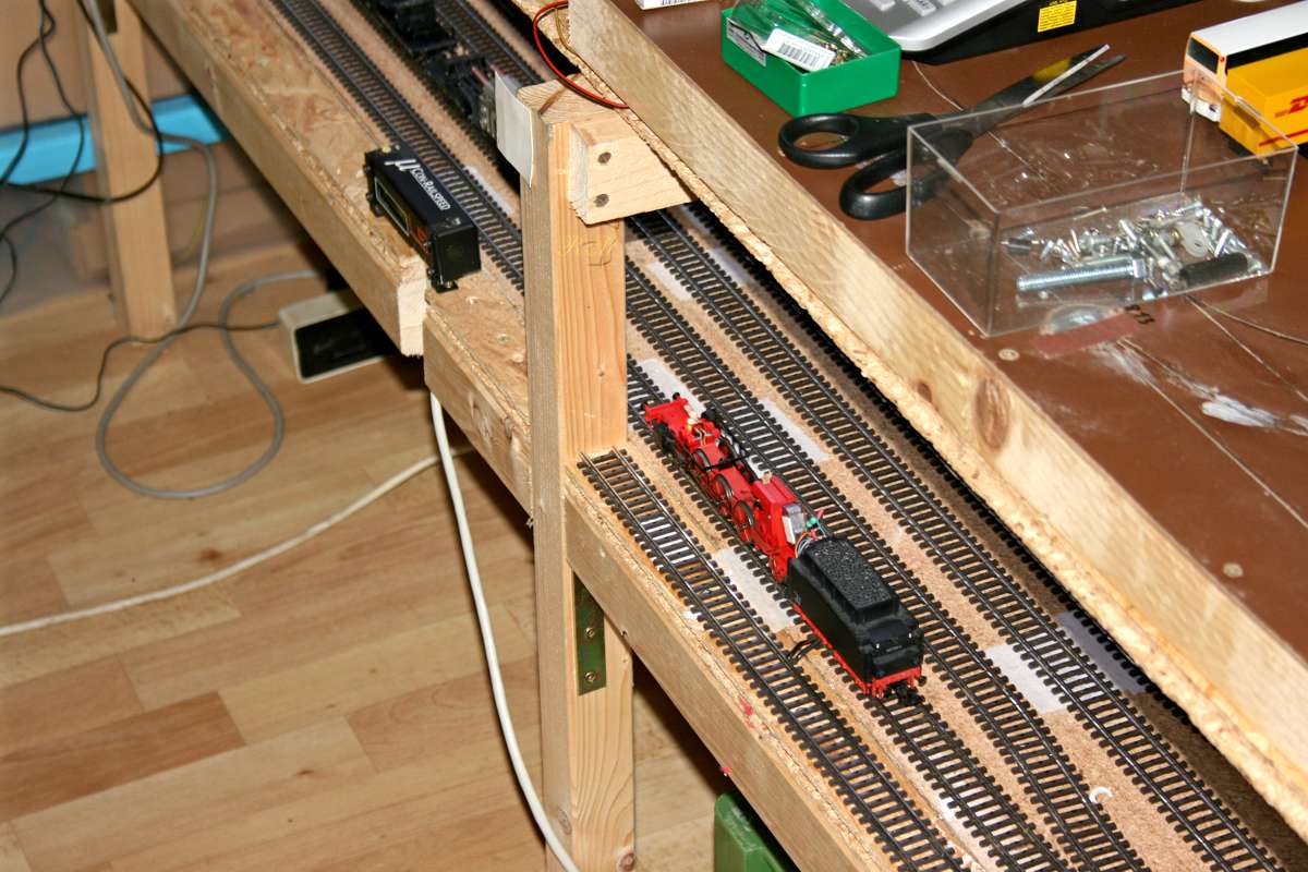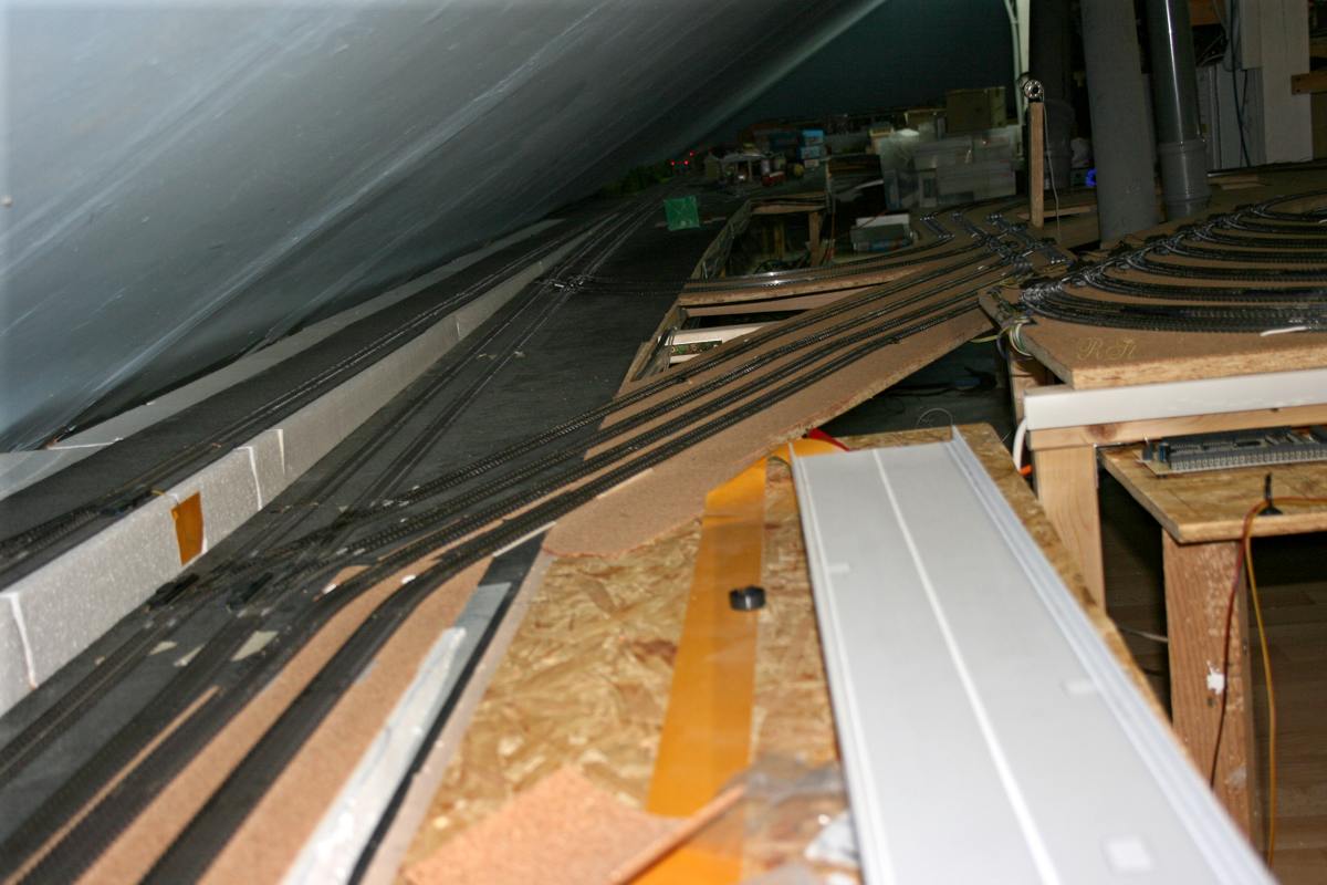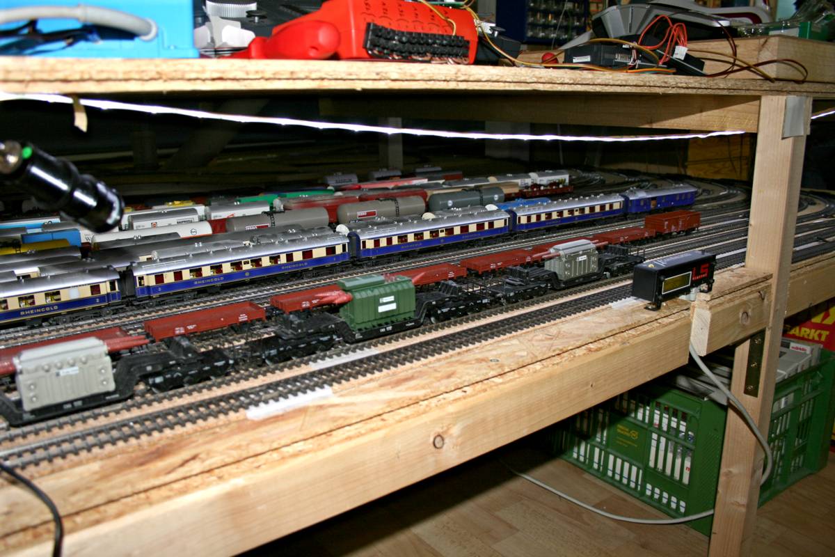 | Im großen Schattenbahnhof befindet sich die Einmessstrecke der automatischen Loks. Neu installierte Kamera mit einer hängenden Ausleuchtung. |