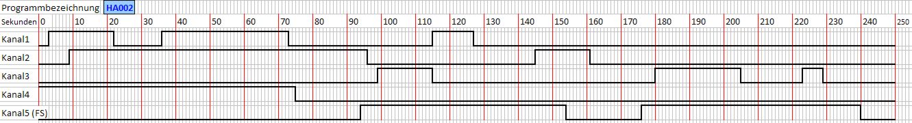 Etwas weiter oben befindet sich der Download einer Zeitdiagrammvorlage. Nach dieser Vorlage wird ihr Programm erstellt. Alternativ zur Vorlage können auch die Schaltzeiten übermittel werden. Jeder Kanal kann maximal 10 mal innerhalb eines Programmablaufs schalten. Wie ein Zeitdiagramm ausschauen kann sehen sie unterhalb des Produktbildes. Anklicken zum Vergrößern.