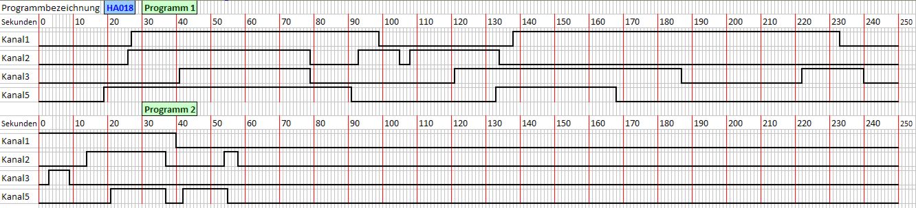 Wie erhalte ich meine individuell programmierte Platine? Etwas weiter oben befindet sich der Download einer Zeitdiagrammvorlage. Nach dieser Vorlage wird ihr Programm erstellt. Alternativ zur Vorlage können auch die Schaltzeiten übermittel werden. Jeder Kanal kann maximal 10 mal innerhalb eines Programmablaufs schalten. Wie ein Zeitdiagramm ausschauen kann sehen sie unterhalb des Produktbildes. Anklicken zum Vergrößern.