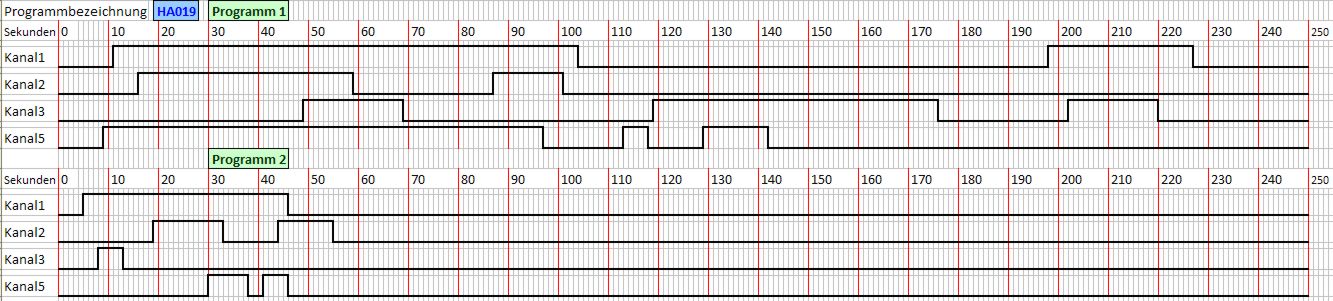 Etwas weiter oben befindet sich der Download einer Zeitdiagrammvorlage. Nach dieser Vorlage wird ihr Programm erstellt. Alternativ zur Vorlage können auch die Schaltzeiten übermittel werden. Jeder Kanal kann maximal 10 mal innerhalb eines Programmablaufs schalten. Wie ein Zeitdiagramm ausschauen kann sehen sie unterhalb des Produktbildes. Anklicken zum Vergrößern.