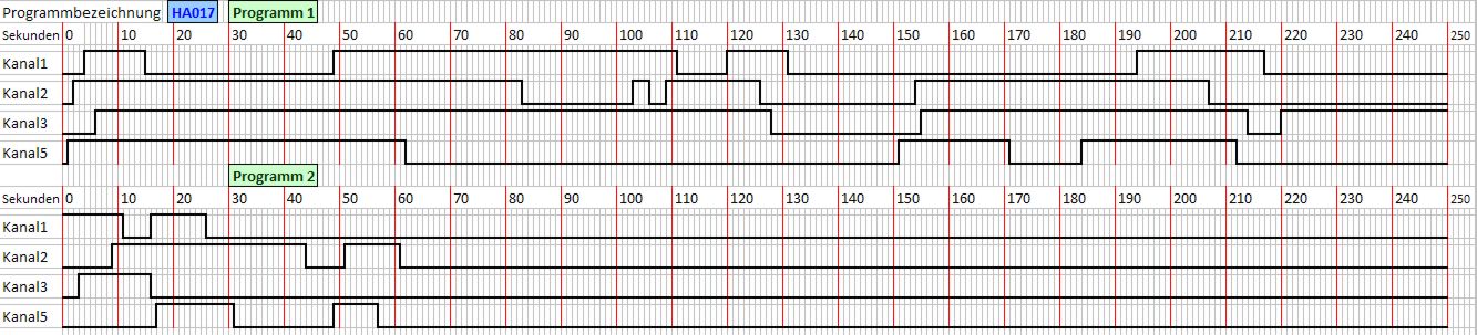 Etwas weiter oben befindet sich der Download einer Zeitdiagrammvorlage. Nach dieser Vorlage wird ihr Programm erstellt. Alternativ zur Vorlage können auch die Schaltzeiten übermittel werden. Jeder Kanal kann maximal 10 mal innerhalb eines Programmablaufs schalten. Wie ein Zeitdiagramm ausschauen kann sehen sie unterhalb des Produktbildes. Anklicken zum Vergrößern.