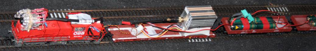 Nach längerer Zeit wollten Thomas und ich wieder ein Video unserer fortgeschrittenen Baustelle mit dem Videozug drehen. Wie man auf den Aufnahmen des ersten diesbezüglichen Versuches sieht hat dieses Video einen Grünstich. Erst dache ich es wäre deshalb weil es damals zu finster war. Also versetzte Thomas das Light@Night Beleuchtungssystem in den Tagmodus. Damit sollte das Licht ausreichend sein. Leider hat sich herausgestellt, dass die Farbqualität dadurch nicht ausreichend besser wurde. Also was tut man? In der Kiste gekramt und noch andere CCD-Kameras herausgesucht. Aber auch diese Kameras erfüllten nicht die an sie gesetzten Anforderungen. Somit brachte dieser Tag leider kein (Video)ergebnis. Weitere Versuche in dieser Richtung werden unternommen werden. Das Bild zeigt unsere provisorische Videolok mit LED-Scheinwerfer, dem Sender und einem Teil der Akkus. Eine andere Videolok ist geplant. Doch darüber später mehr. |