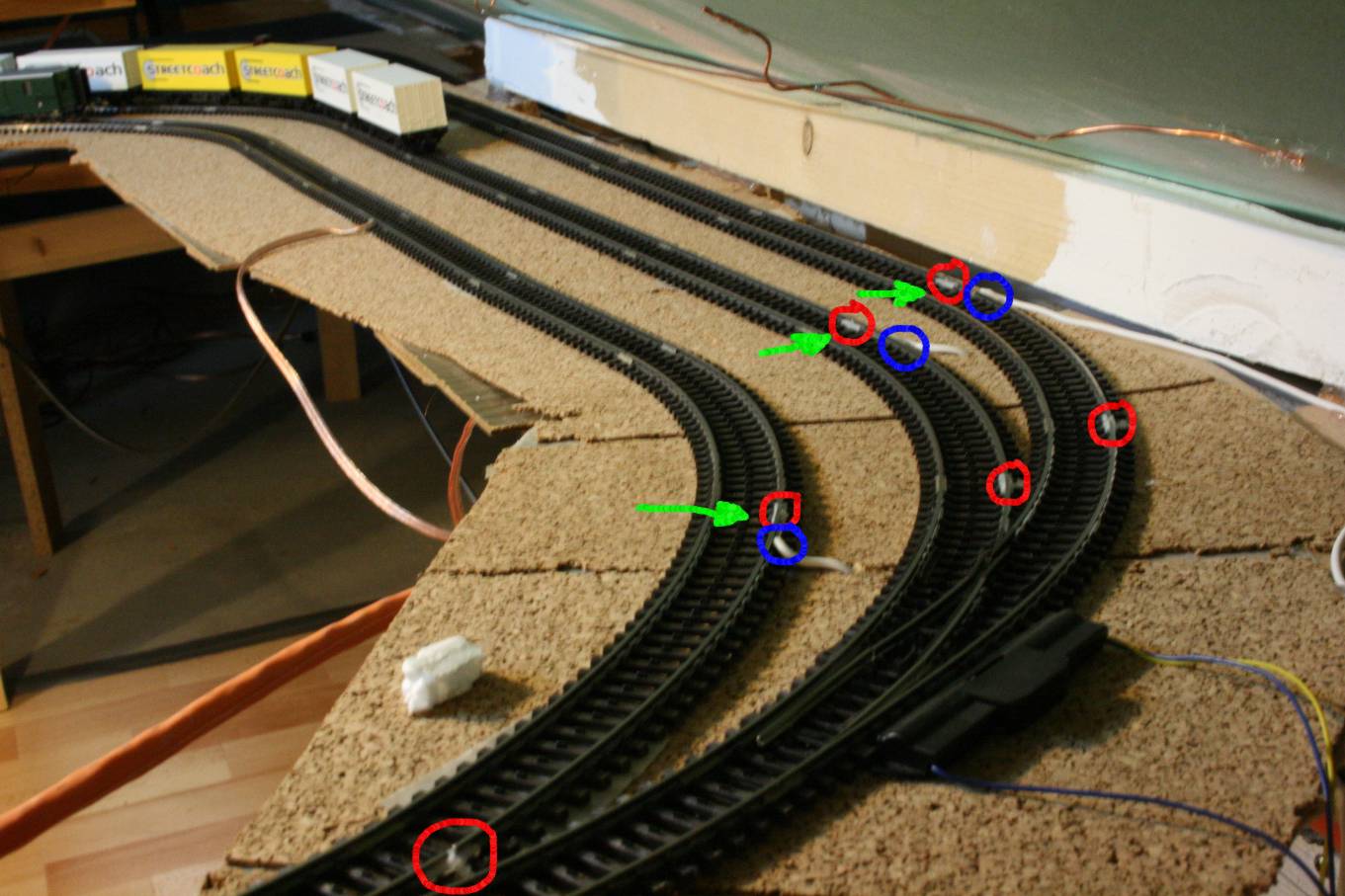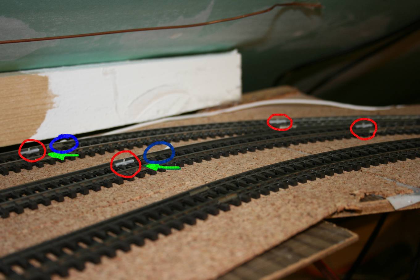 Legende: (Die Grafik ist der Railware Dokumentation entliehen) Rote Kreise: Eingebaute Schienenisolierer aus Kunststoff Blaue Kreise: Anschlusspunkte für Rückmeldekabel Grüner Pfeil: Hier bleiben die Züge exakt stehen wenn sie in Richtung Weiche abbremsen.