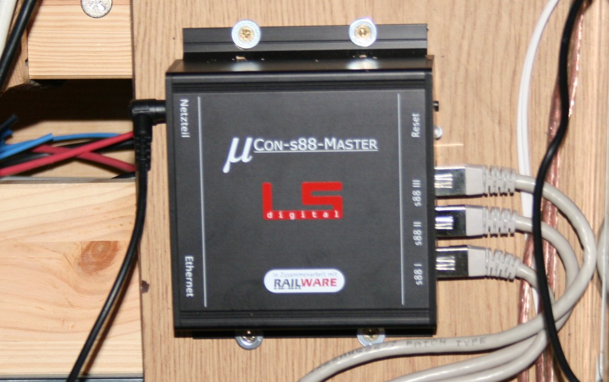 Wir waren mit dem ganzen System nicht wirklich zufrieden. Es kam immer wieder sporadisch zu Fehlauslösungen. Blockstrecken meldeten besetzt obwohl gar kein Zug drauf fuhr oder stand. Ärgerlich. Der PC gab eine Geisterzugwarnung aus und hielt alle Züge in der Nähe der fehlerhaften Rückmeldung an. Das war wohl nicht das Gelbe vom Ei. Ein Austausch des gesamten Rückmeldesystems kam nicht wirklich in Frage. Der Aufwand wäre doch enorm. Da wurde ich auf eine neue Rückmeldezentrale am Modellbahnmarkt aufmerksdam. Der µCon-S88 Master von Lokstoredigital. Seine technischen Daten versprachen fast unglaubliches. Zumindest nahm er unserem Steuerungsprogramm die gesamte Entprellung der Rückmeldung hardwaretechnisch bereits ab. Technisch war der Master auch Stand der Technik. Die Datenübertragung zum PC erfolgt über Netzwerk und die Rückmeldemodule werden ebenfalls über Netzwerkkabel nach der S88-N Norm angeschlossen. Auf Grund seiner guten Daten und der guten Erfahrungen anderer Modellbahner entschloss ich mich kurzfristig den µCon-S88 Master zu besorgen. |