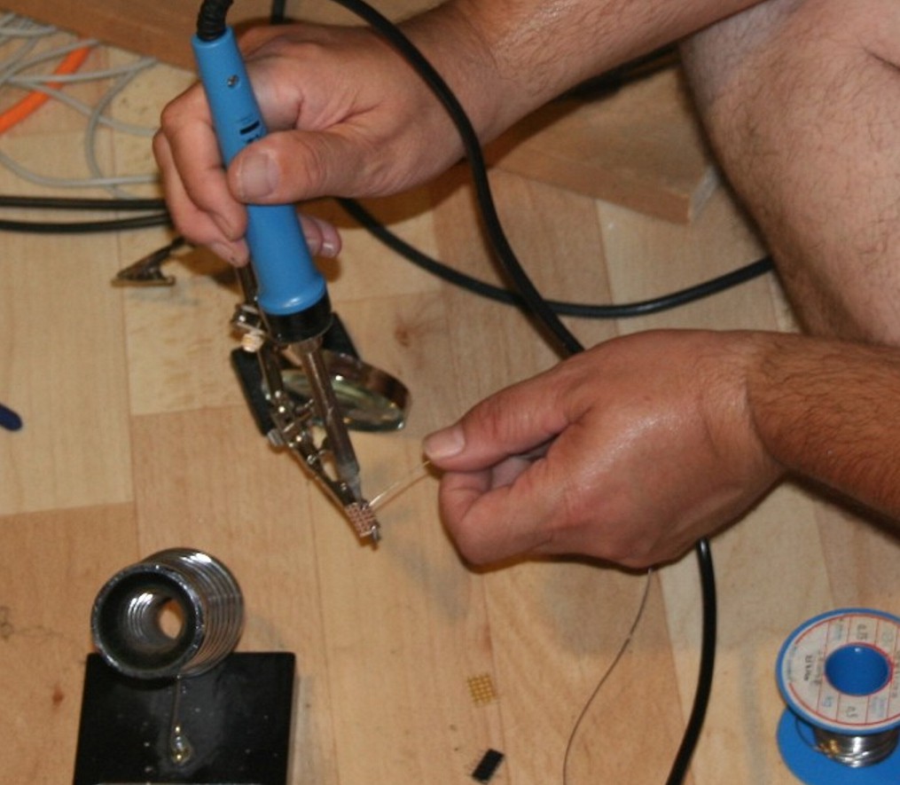 Die Arbeit die aufhiehlt war die Umsetzung der 6pol. S88 Norm unserer Rückmeldemodule auf die 8pol. S88-N Norm des µCon-S88 Master. Bild 1: Thomas lötet gerade an einem Adapter vom 8pol. S88-N auf den 6pol. S88. Bild 2: Über den Adapter geht es in das erste Rückmeldemodul. Bild 3: Die Beschaltung von 8pol. auf 6pol. |