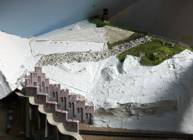Der Wanderweg verläuft mitten über das Fenster. Da durfte ich die Wegbefestigung mit den Kieselsteinen nicht durchgängig anlegen, sondern am jeweiligen Fensterrand abtrennen. Die Gipsunterlage konnte ich ja noch mit Papier dazwischen unterbrechen, zumindest war das meine Intention, aber nach dem Trocknen des Gipses konnte ich nicht mehr so einfach das Fenster öffnen, da vor allem die Kieselsteine geeckt und gezwickt haben. Nacharbeiten waren dann notwendig. Danach konnte ich das Fenster mit viel Gefühl ohne gröbere Beschädigungen an den Rändern öffnen. |