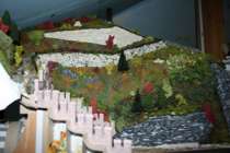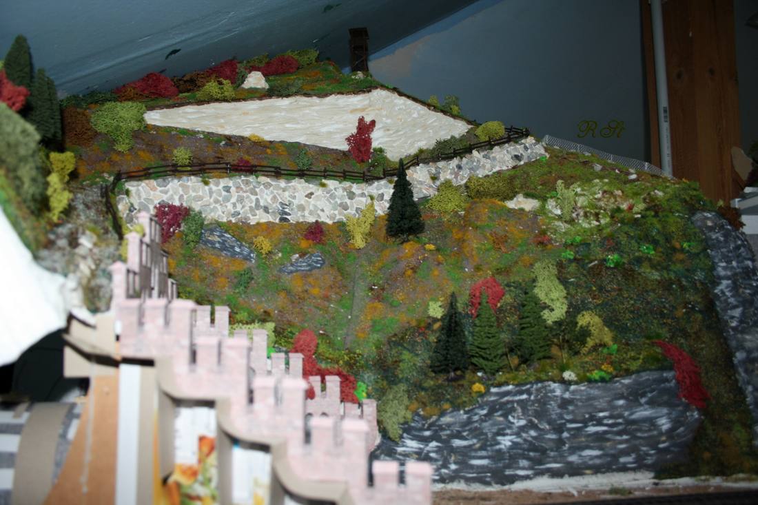 In 3 weiteren Arbeitsschritten erfolgte die restliche Gestaltung, an Ort und Stelle. Der Zaun des Wanderweges war eine geduldige Kleinarbeit, denn auch dieser durfte nicht durchgehend fix verbunden bleiben. Am rechten Fensterrand gibt es deshalb einen beschädigten Zaun, indem die beiden Latten an einer Seite heruntergefallen sind, und somit keine Verbindung mehr haben. Hoffentlich kommt da kein Wanderer auf dumme Gedanken!